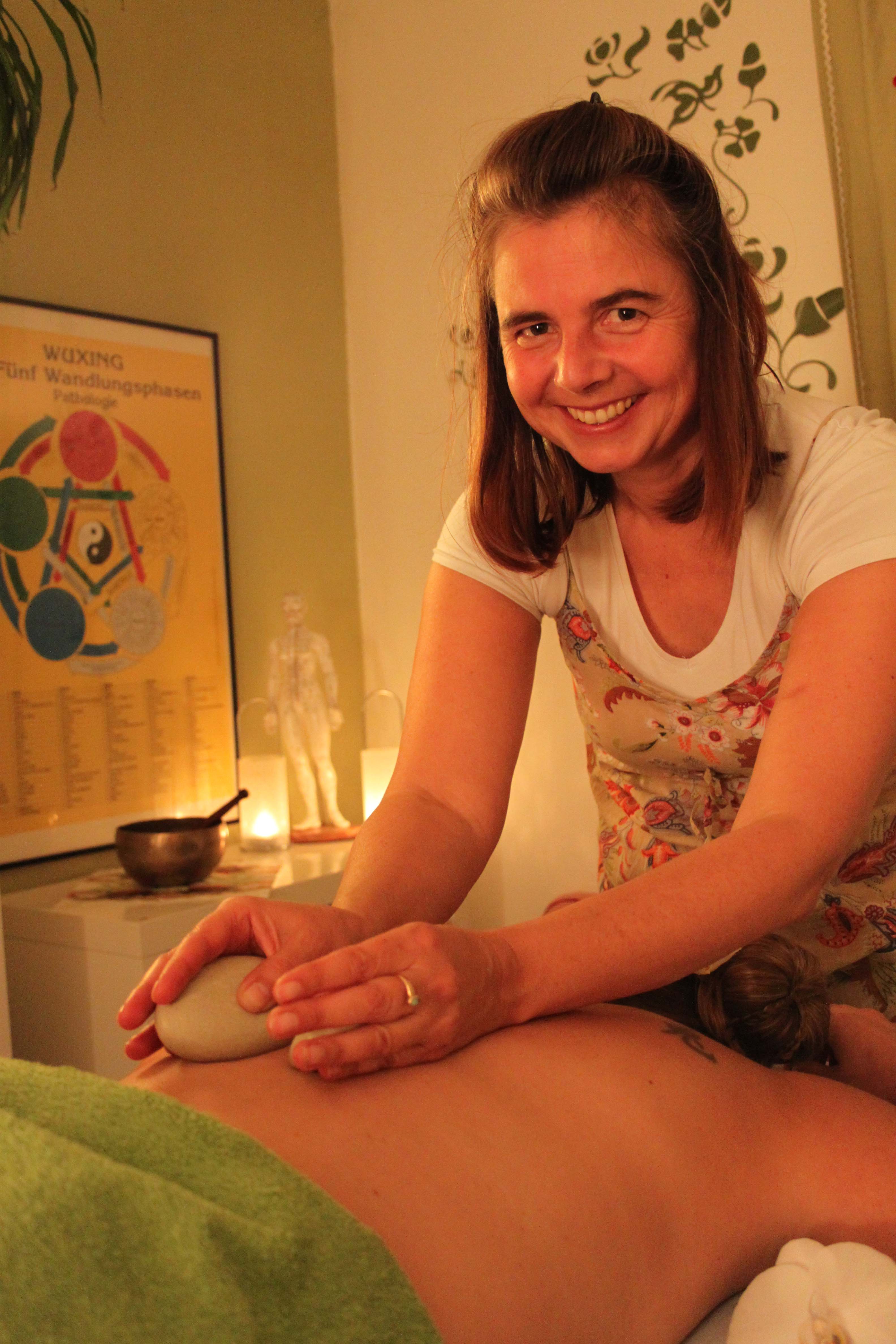 Hot Stone Massage nach der chinesischen Meridianlehre Die Hot Stone Massage ist eine faszinierende Verbindung zwischen Massage, Aromatherapie und Energiebehandlung. Die Behandlung erfolgt aufgrund der chinesischen 5-Elemente -Lehre mit warmen, geschmeidigen Steinen in Kombination mit ausgesuchten ätherischen Ölen. Im Rahmen meiner Aromatherapieausbildung berate ich Sie gerne, welches ätherische Öl für Sie geeignet ist. Über 50 verschiedene Düfte stehen zur Verfügung, alle 100% naturrein. Genießen Sie die Zeit der Entspannung - eingehüllt in heilsamen Duft und Wärme. Preis: 90 Minuten: 60 Euro (Rücken und Beine) 60 Minuten: 45 Euro (Rücken)